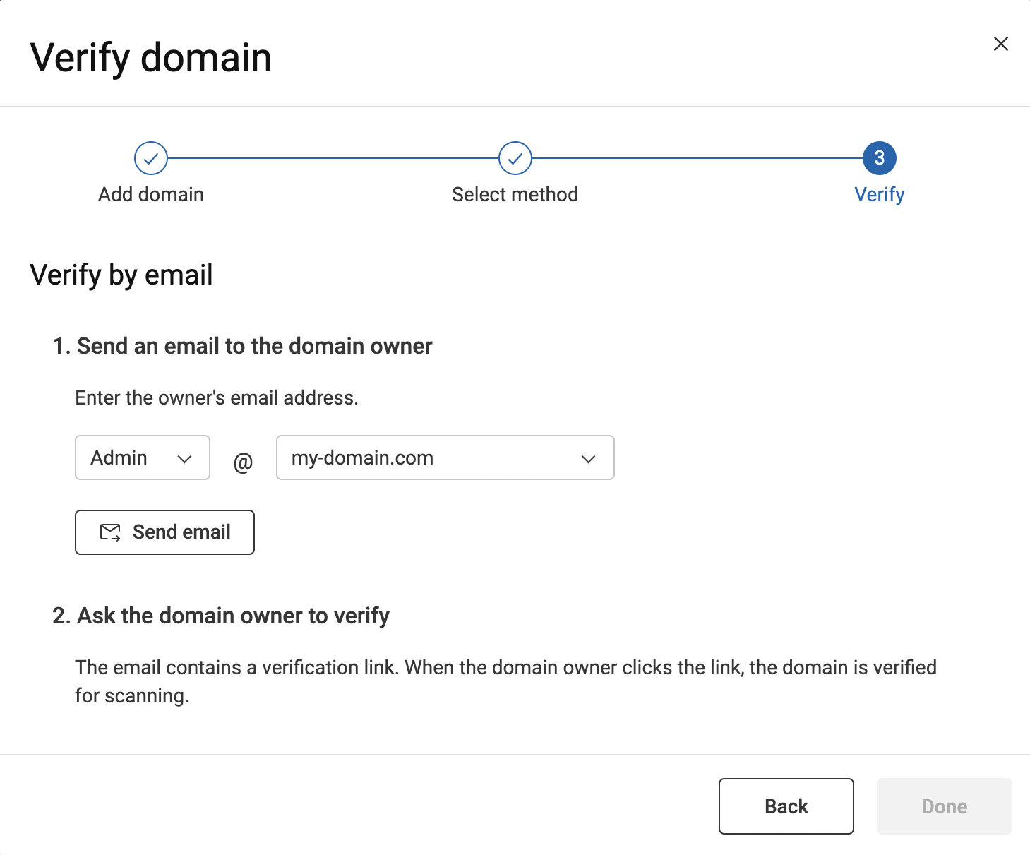 プロトコルは含めないでください。サブドメインだけを検証する場合にのみ、サブドメインを指定します。例えば、ドメインとすべてのサブドメインを確認するには、「my-domain.com」と入力します。 -