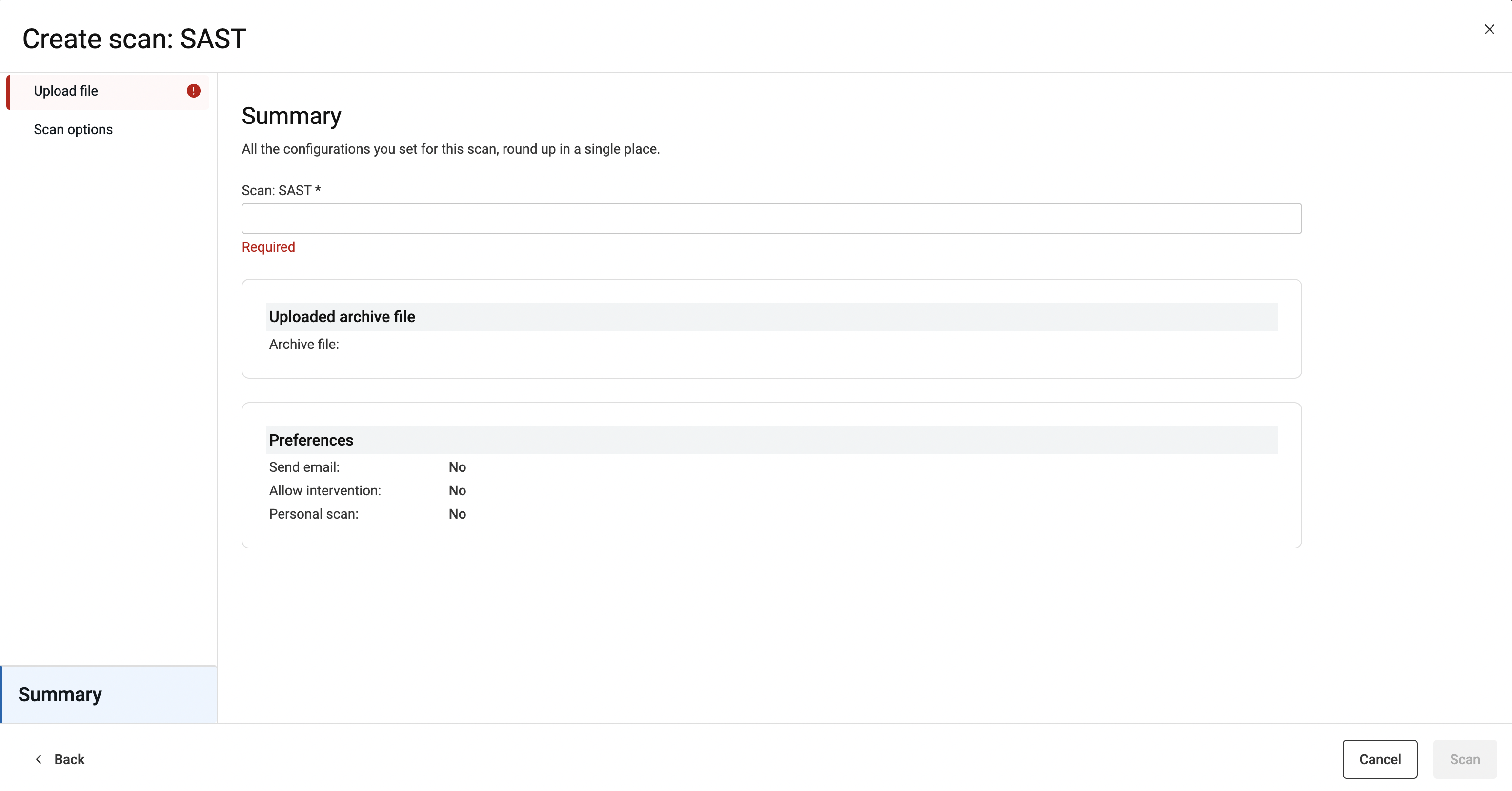 - 「サマリー」タブで、必要に応じてスキャンに付けられたデフォルト名を編集し、スキャンの選択内容を確認します。