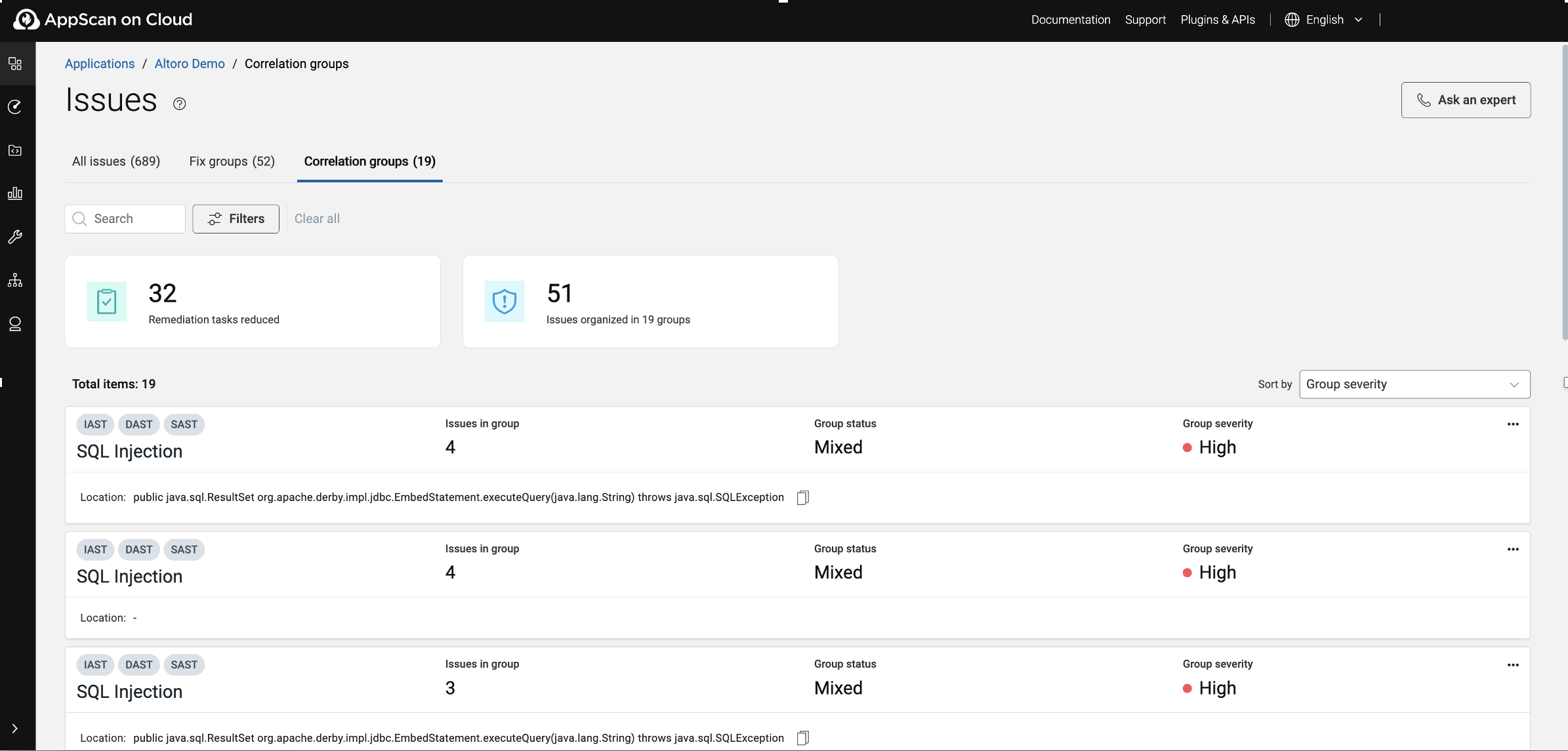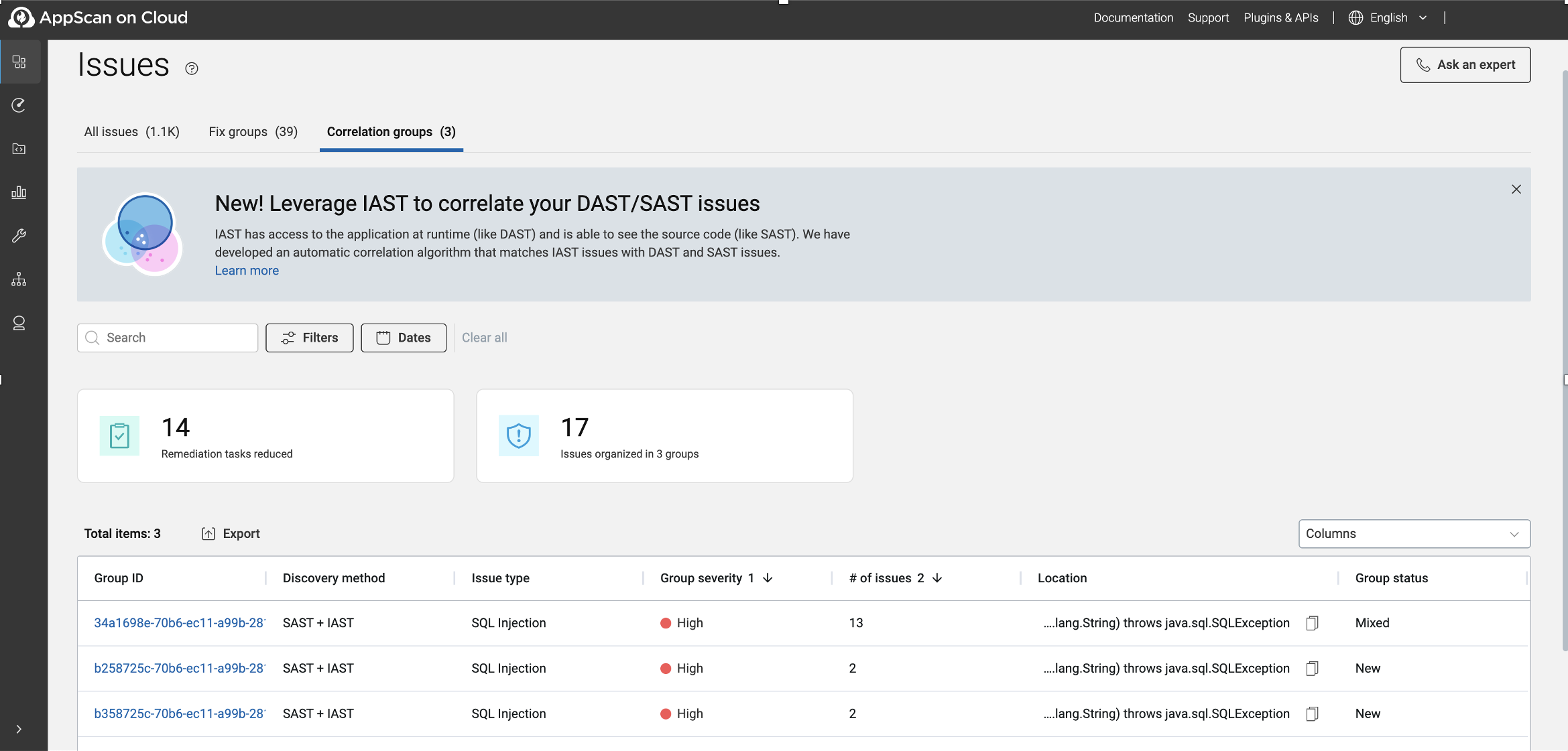 IAST サブスクリプションがあれば、関連する IAST、DAST、または SAST の問題が検出されるたびに、相関が自動的に更新されます。既存の相関グループは新しい問題で自動的に更新され、必要に応じて新しいグループが作成されます。ユーザー・アクションは不要です。