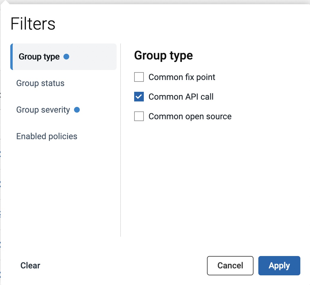 フィルター 表示される問題のリストをフィルタリングするには、「フィルター」ボタンをクリックし、次の任意の組み合わせでフィルタリングします。グループ・タイプグループ・ステータスグループの重大度有効なポリシー言語、および問題タイプ