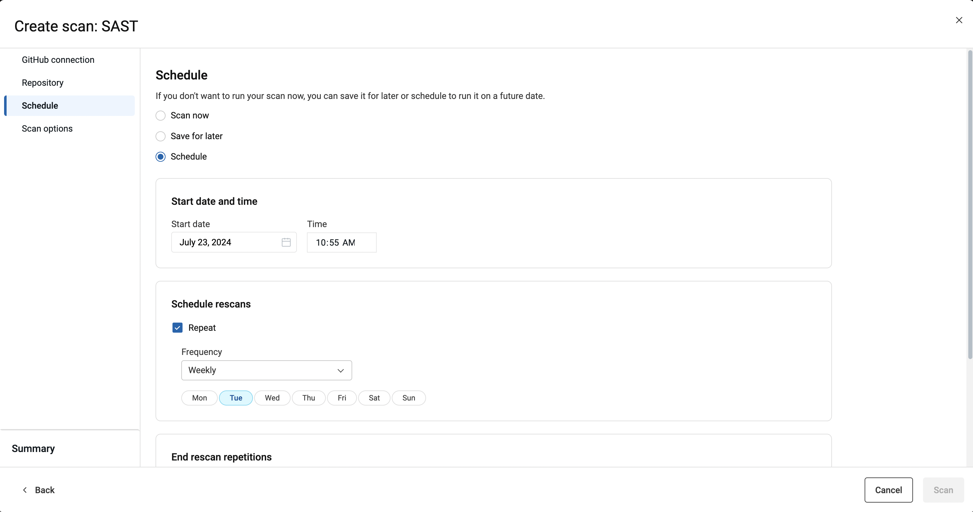 - 「スケジュール」タブで、スキャンをすぐに実行するように指定し、後で使用するためにスキャン設定を保存するか、反復スキャンをスケジュールします。