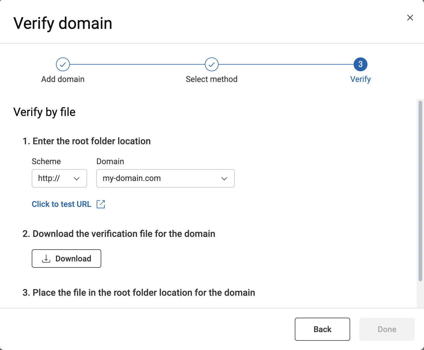请勿包含协议。仅当要验证子域时,才指定子域。例如,要验证域和所有子域,请输入my-domain.com。 -