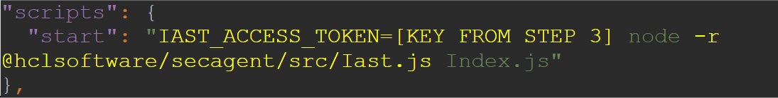 package.json中的启动脚本用作运行命令。编辑启动脚本以将上述步骤 3 中的代理程序密钥设置为环境变量,并将步骤 4 中的 IAST 代理程序作为所需包运行。例如,如果原始命令为: