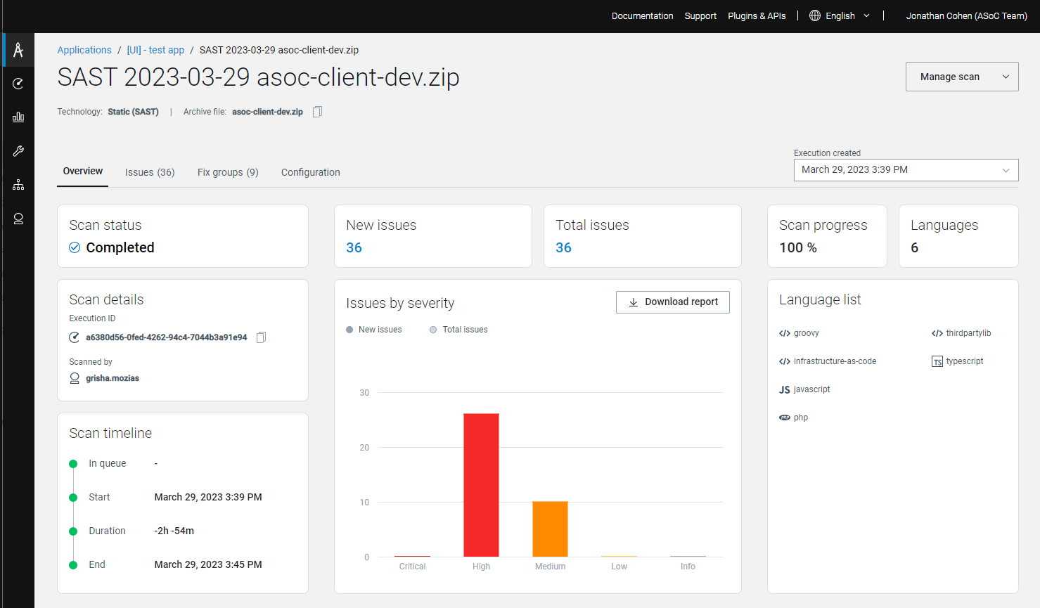 - 详细信息:状态、开始和结束日期、扫描人、新问题和活跃问题的持续时间和数量。