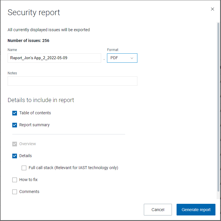 - 按一下產生報告。報告會產生並儲存至您的機器。註: 「過濾的安全報告清單」會在您按一下按鈕時產生。因此,與反映掃描完成時資料的一般「安全報告」不同,過濾的報告會反映所找到問題的最新狀態。例如,從「新的」變更為「已修正」狀態的問題會在此報告中顯示為「已修正」。註: 若是容量非常大的報告,可能無法產生