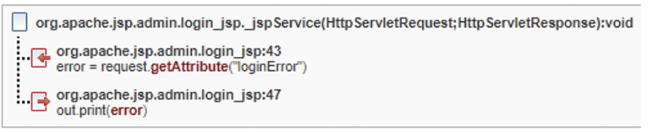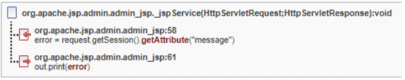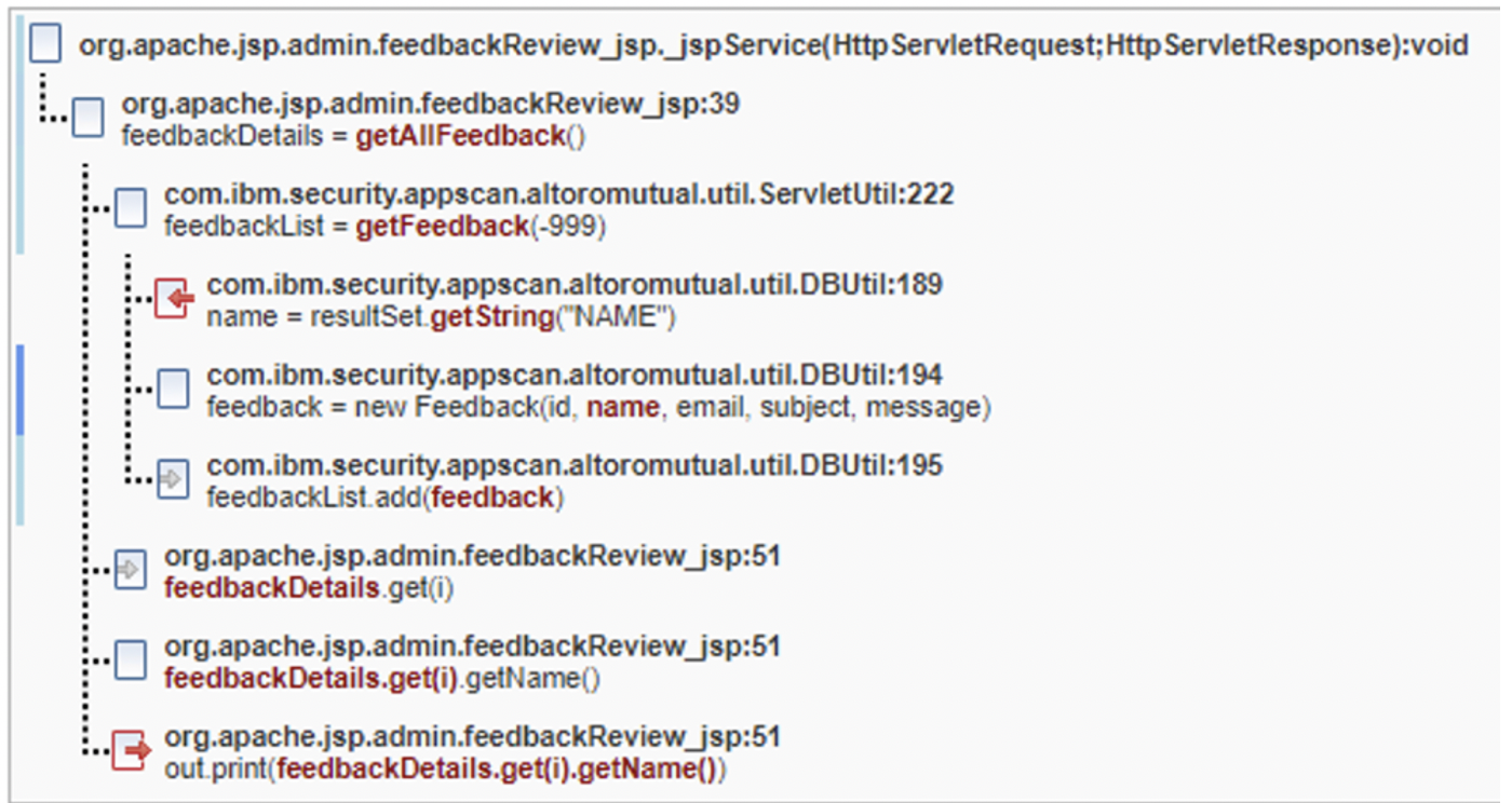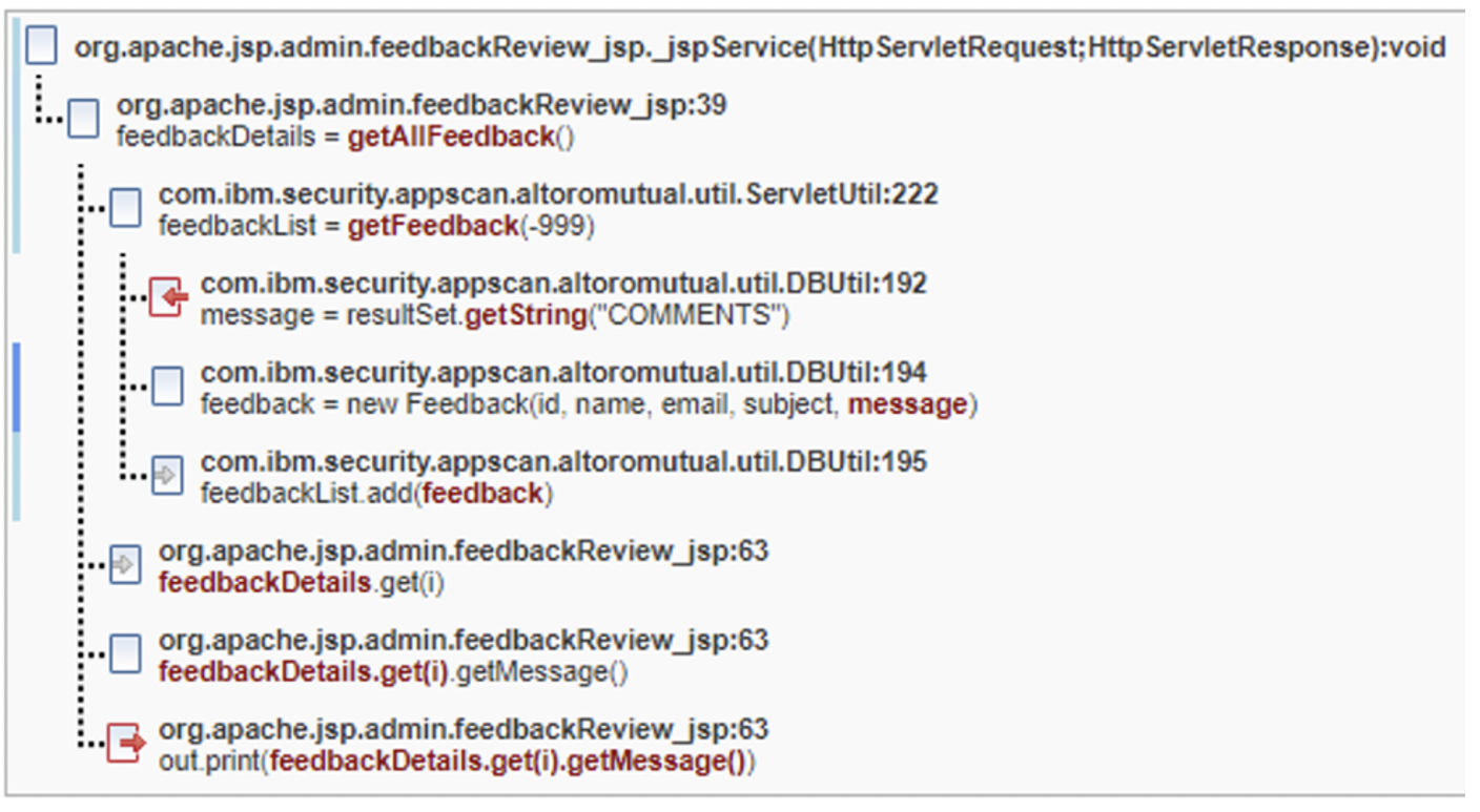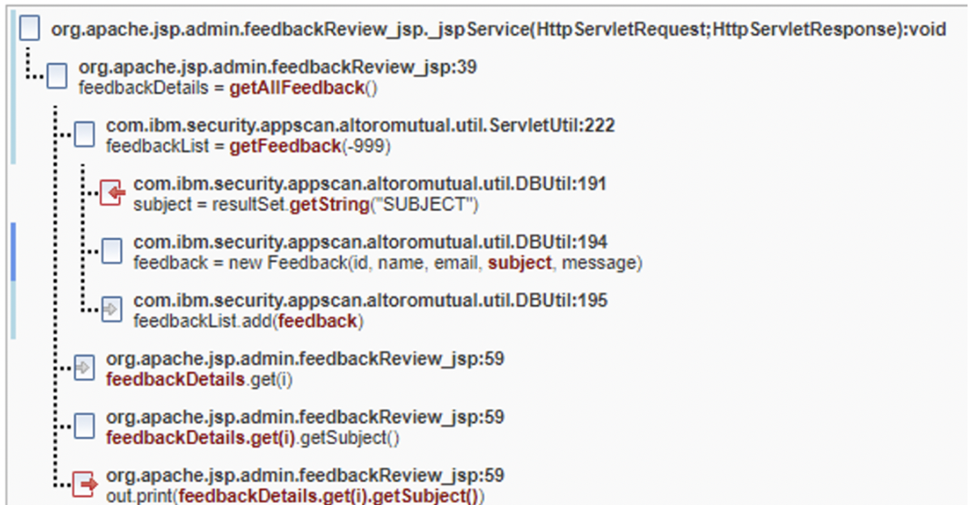 「追蹤」告訴我們有五種不同的症狀存在,並因顯示在不同行的 out.print 呼叫而進入瀏覽器頁面。如果 new Feedback 呼叫將容許的字元加入容許清單,或是針對建構子內的這五個實體資料進行某種消毒/驗證,則系統會解析修正程式群組中的所有發現項目。如果忽略修正程式群組修正點,則需要為每一個發現項目新增四個不同的編碼呼叫。