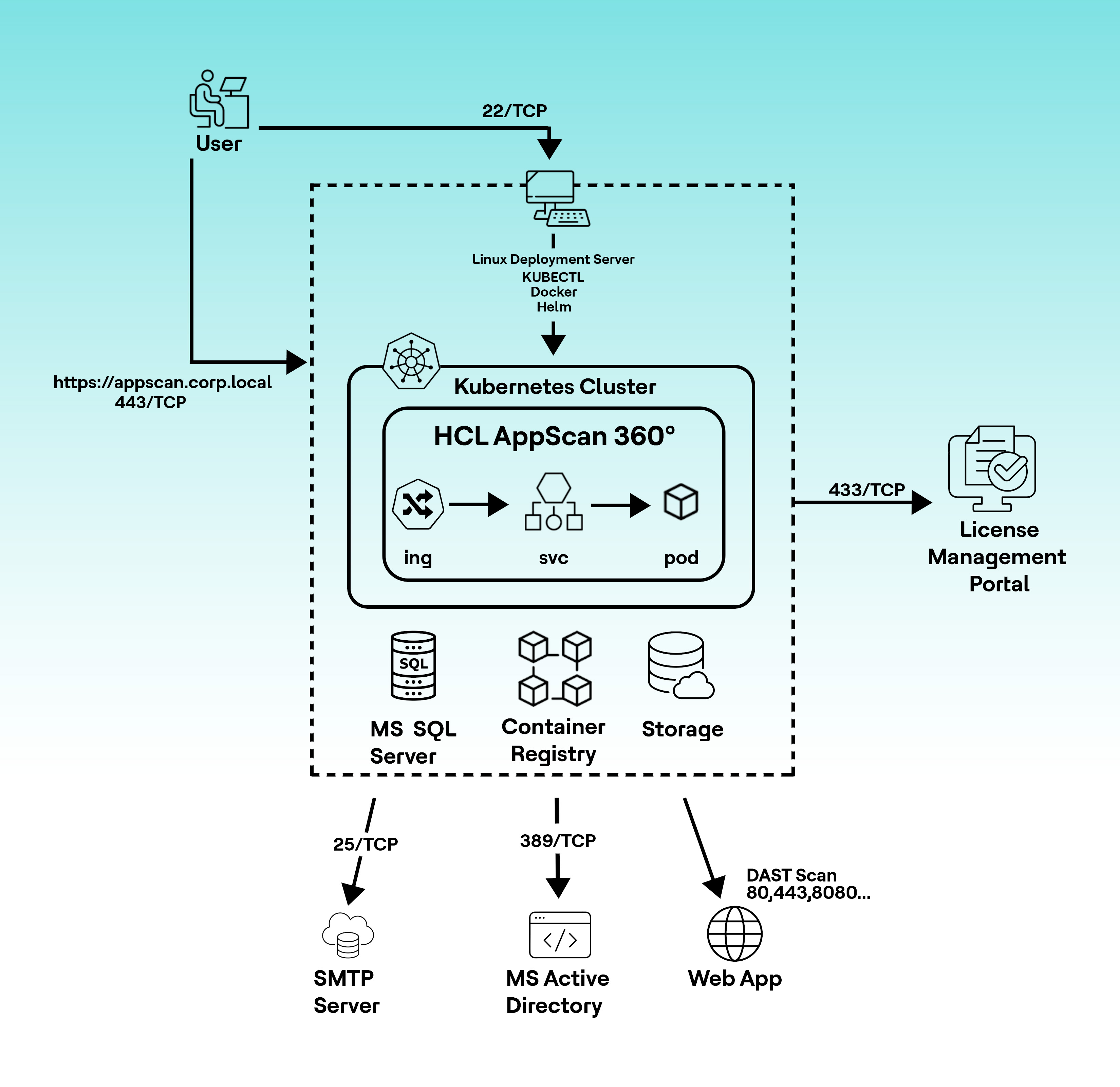透過 HCL AppScan 360° 分散式安裝,您可以獲得更強大的儲存器化測試與更多並行掃描。分散式安裝需要在安裝前進行更多設定,但也允許對元件進行更多控制。