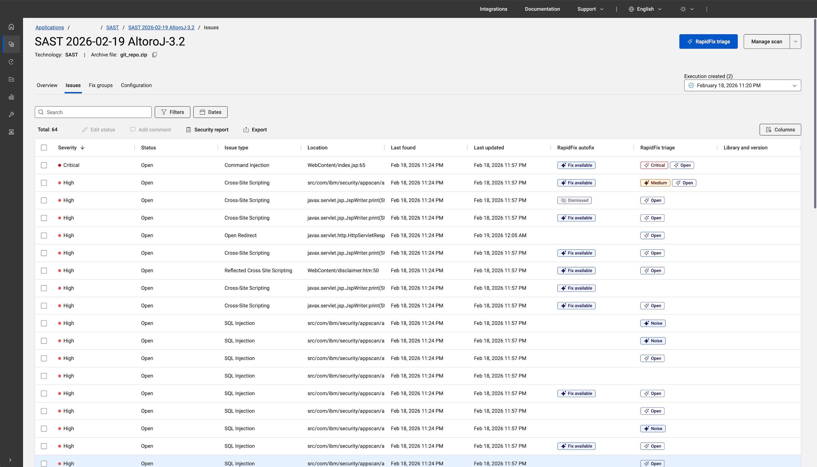 HCL AppScan RapidFix 是一種以 AI 驅動的解決方案,可將應用程式安全漏洞的分類與補救流程自動化。HCL AppScan RapidFix 適用於 SAST 結果。