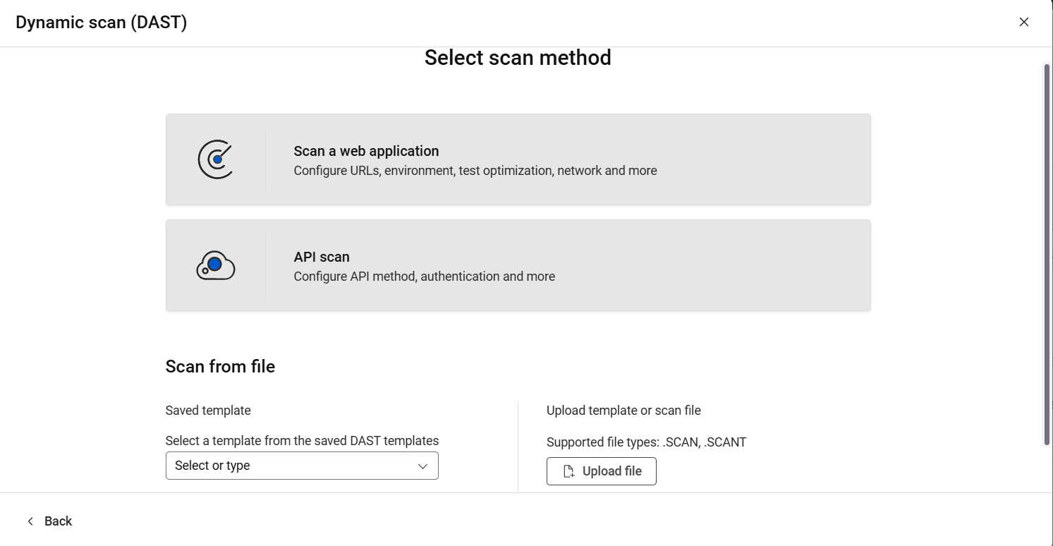 AppScan 360° 可以對執行於瀏覽器或 Web API 中的應用程式執行動態分析。使用 AppScan 360° 中 Web 應用程式或 Web API 可以使用的配置選項,或上傳 AppScan Standard 配置(範本檔案)或完整掃描檔。