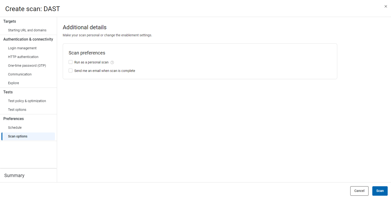 - 在特定「應用程式」頁面上,按一下「建立掃描」,然後按一下「DAST 動態分析」下的「建立掃描」以開啟精靈。
