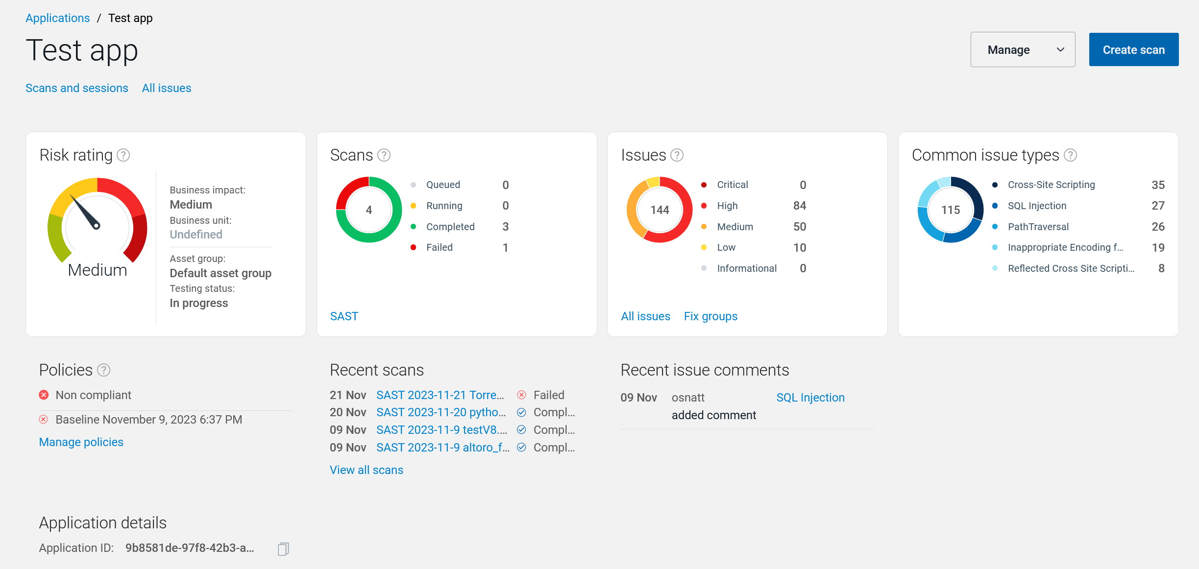 應用程式報告 應用程式頁面的上半部有一個儀表板,其具有的圓餅圖類似於主儀表板的圓餅圖,而下半部包含清單和連結。這裡將彙總這些資訊。應用程式動作 動作 說明 編輯詳細資料:變更名稱、業務衝擊、資產群組等等。指派安全評級、個人以及其他詳細資料。 管理原則:啟用或停用原則。新增或更新基準線原則。 刪除應用程式 報告 產生應用程式報告: 安全報告 業界標準報告 合規性報告 建立掃描 開啟建立掃描精靈。 在頁面底端的應用程式詳細資料區域中,按一下此圖示,以複製要傳送給其他使用者的掃描 ID。