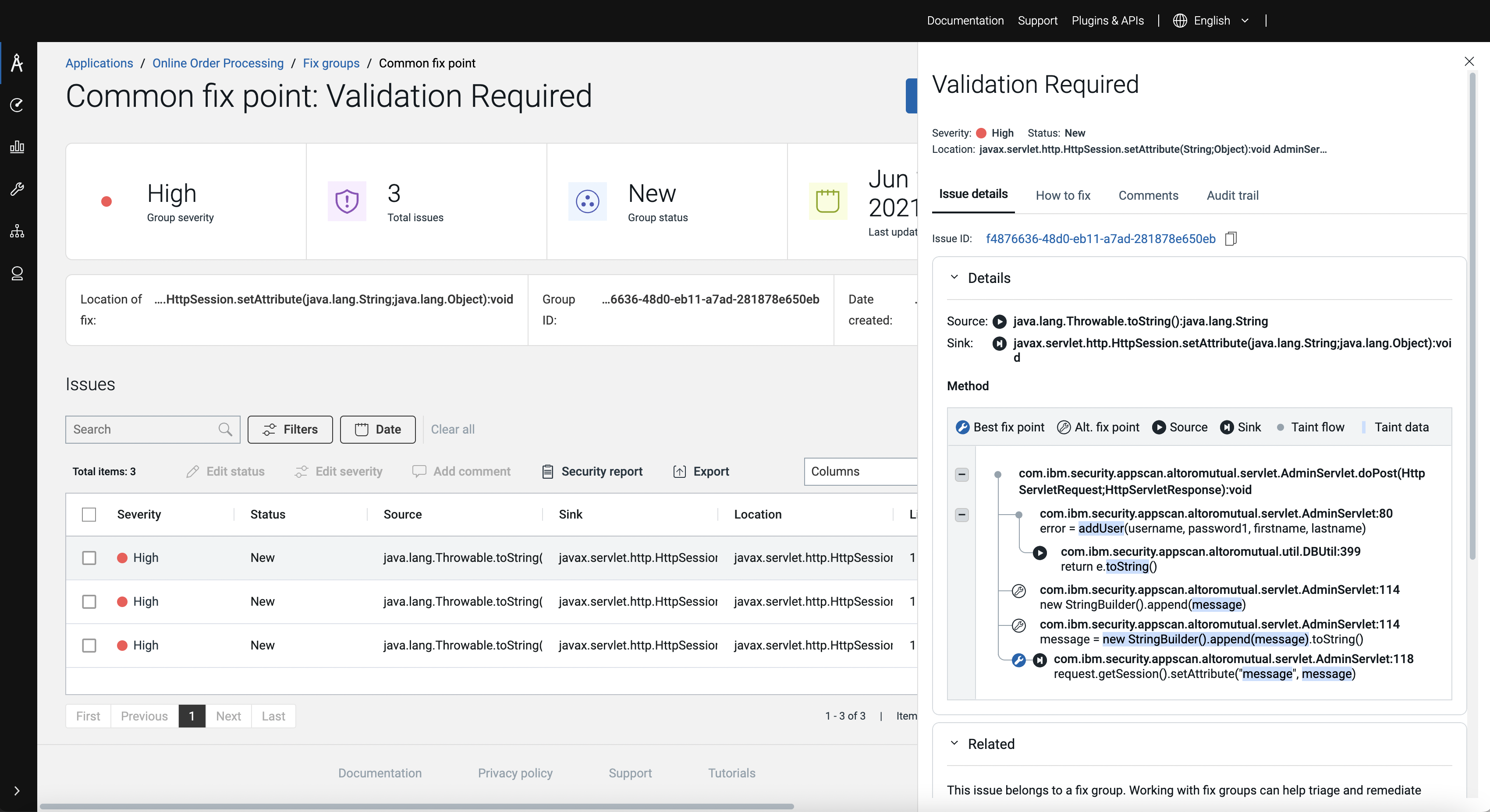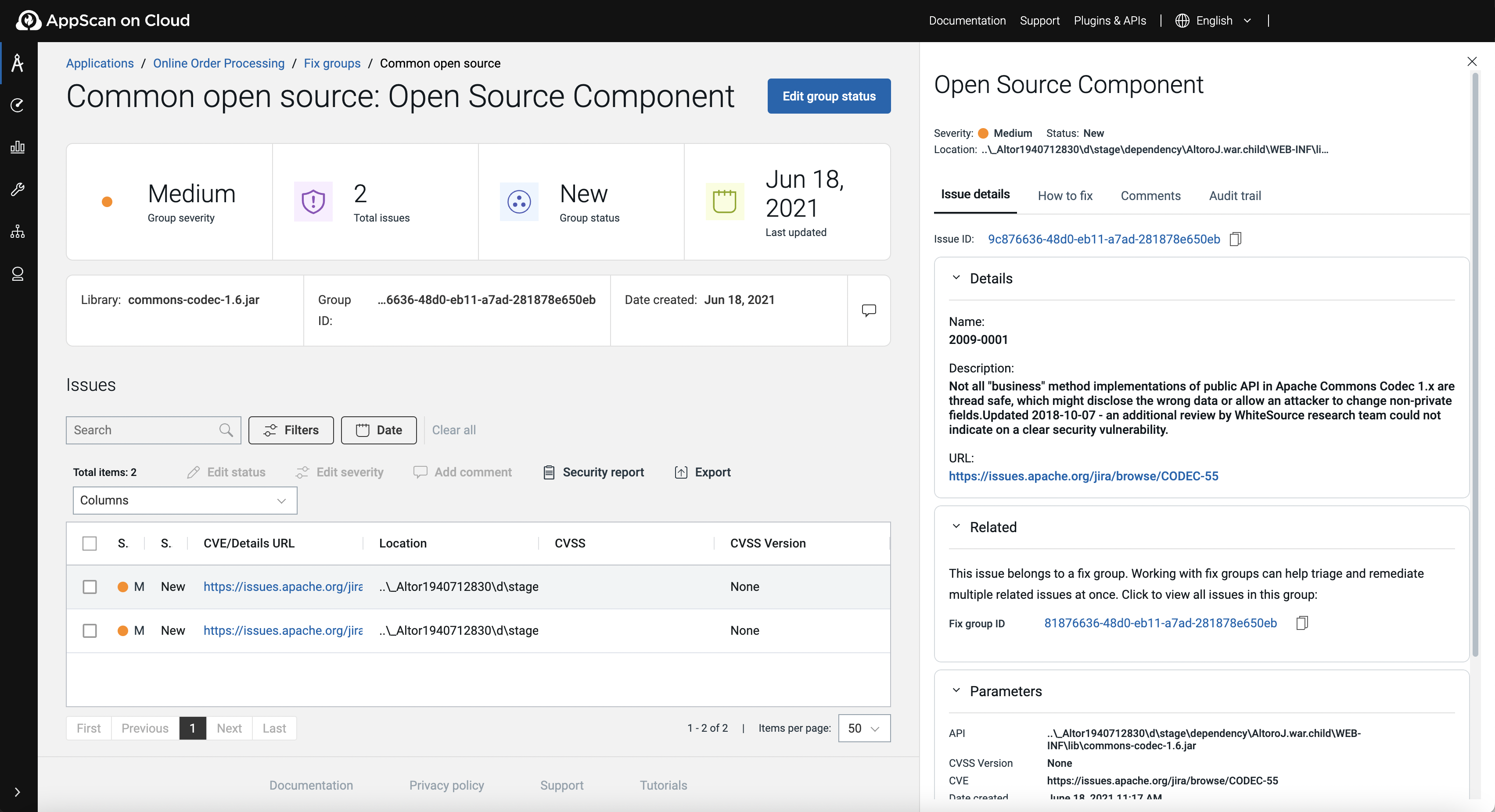 在這個範例中,發現檔案庫有兩個不同的漏洞。因此,已建立修正程式群組來顯示此程式庫的所有漏洞,從而加速檢閱與程式庫相關聯的每一個漏洞。