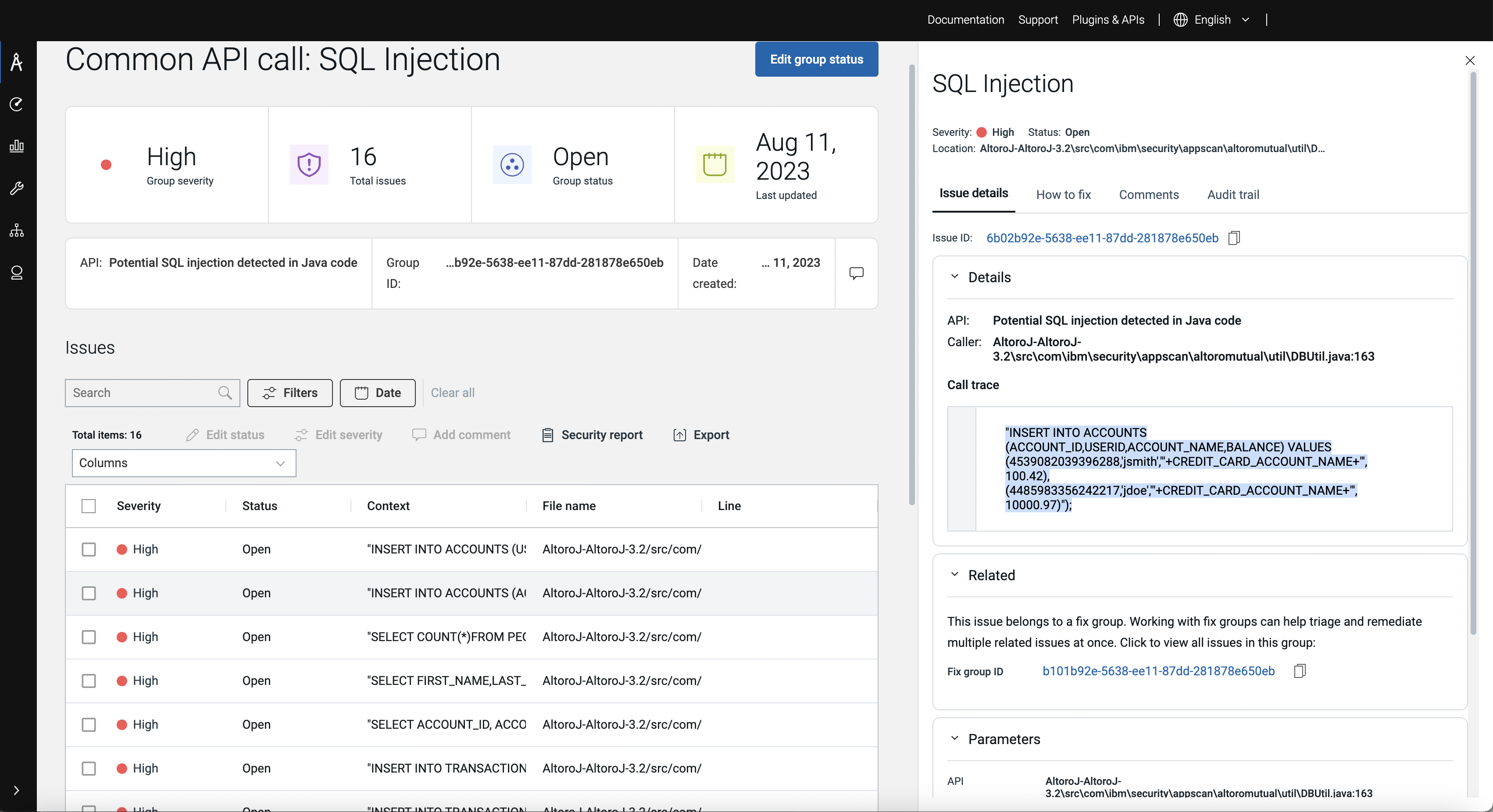 在此範例中,使用共用 API 的修正群組內總計有 16 個問題。這兩個實例都需要個別解析,不過其修正相似,或是在這些實例中的修正可能相同。