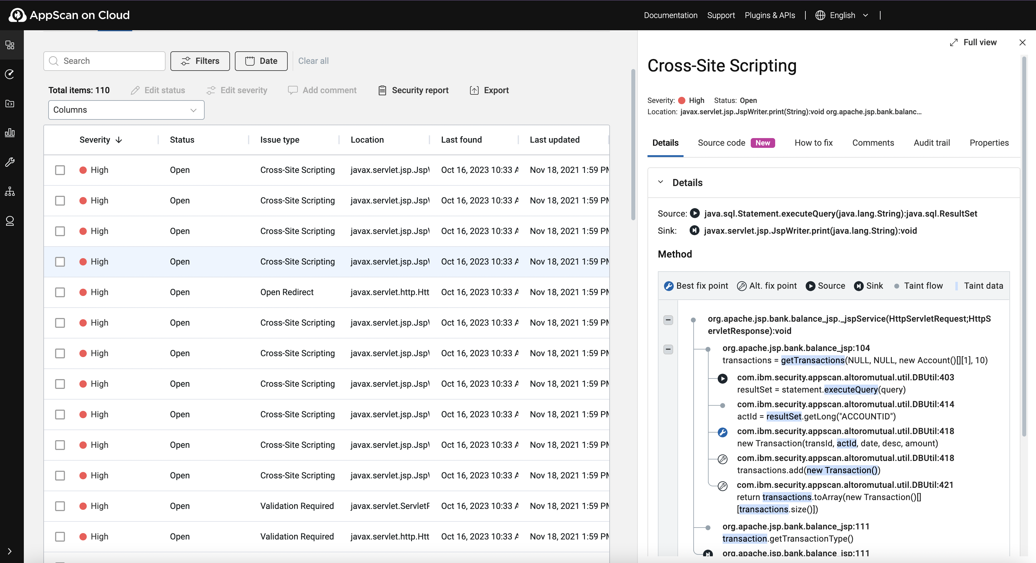 | 呼叫追蹤 | 問題的內容,或流經應用程式區段(包含漏洞)的污染資料流程。「呼叫追蹤」區段包含圖例,可協助您瞭解程式碼的不同區域,包括最佳修正點、替代修正點、來源,接收槽和污染流程。 | |