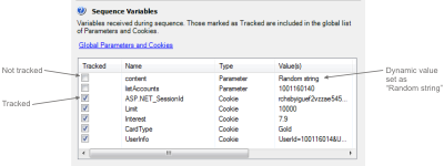 「序列變數」窗格會列出在記錄的序列期間收到的所有變數。AppScan® 視為階段作業 ID 的變數,會自動新增到掃描期間已追蹤的廣域參數與 Cookie 清單中(請參閱 參數與 Cookie)。它們的「已追蹤」直欄會有勾號,表示正在受到追蹤。