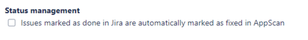 - Dans la section Gestion du statut, cochez la case pour activer ou désactiver la gestion automatique du statut, puis confirmez votre sélection dans la boîte de dialogue qui s'affiche. Lorsque cette option est activée, les problèmes marqués comme terminés dans Jira sont automatiquement marqués comme résolus dans AppScan on Cloud.