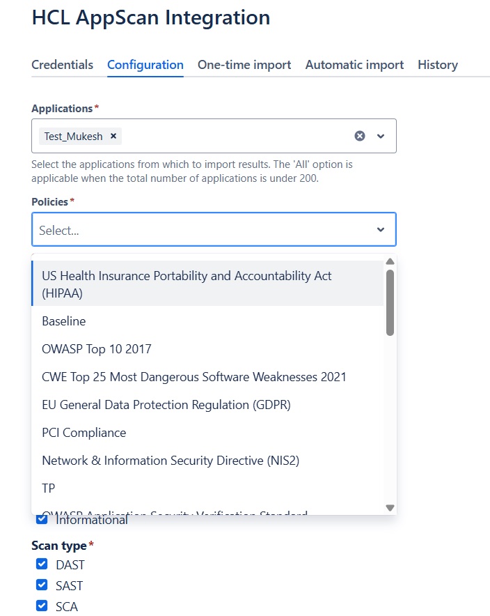HCL AppScan 統合は、ここで選択した内容に基づいて、Jira Cloud に問題をインポートします。各フィルターには複数の値を選択できます。