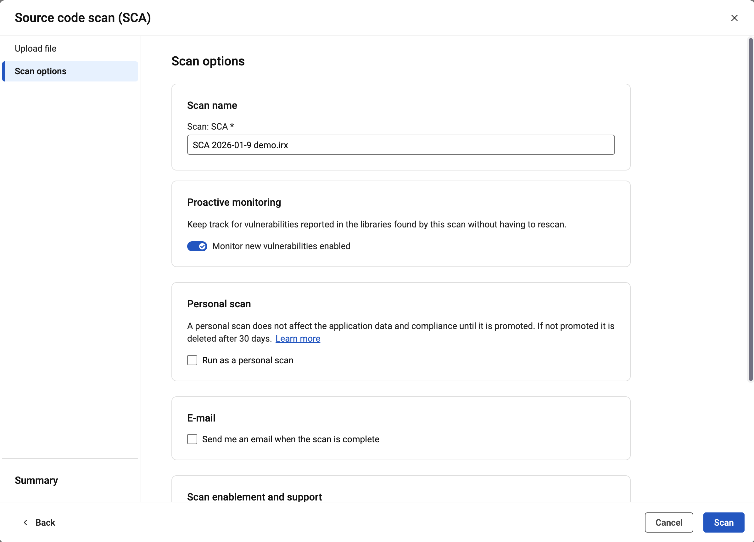 ソフトウェアコンポジション分析 (SCA) スキャンでは、新たに発行された CVE の有無を継続的に監視できます。プロアクティブスキャンは、新しいスキャンと既存のスキャンに適用できます。プロアクティブモニタリングが有効になっている場合 AppScan on Cloud は 24 時間ごとに新しい脆弱性を確認します。