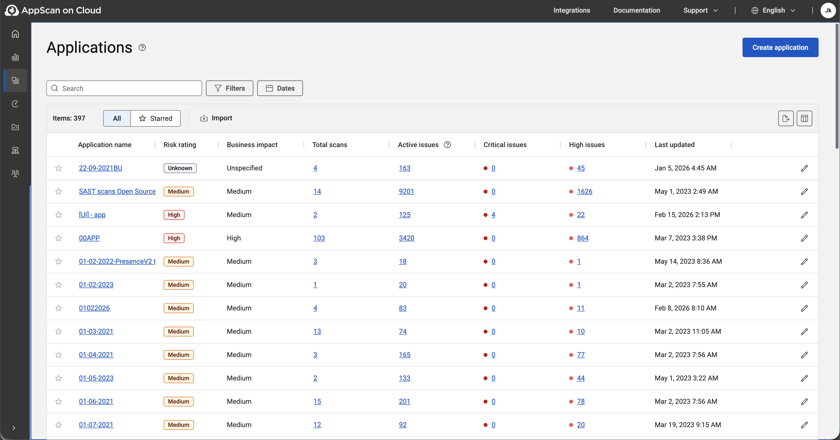The Applications page lists all applications in your organization that are within the asset groups to which you are assigned. From the Applications page, you can create new applications and open individual application pages.