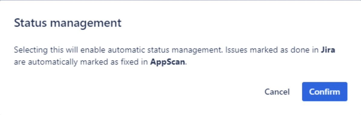 - 在状态管理部分中,单击复选框以启用或禁用自动状态管理,然后在出现的对话框中确认您的选择。启用后,Jira 中标记为“已完成”的问题将在 AppScan on Cloud 中自动更新为“已修复”。