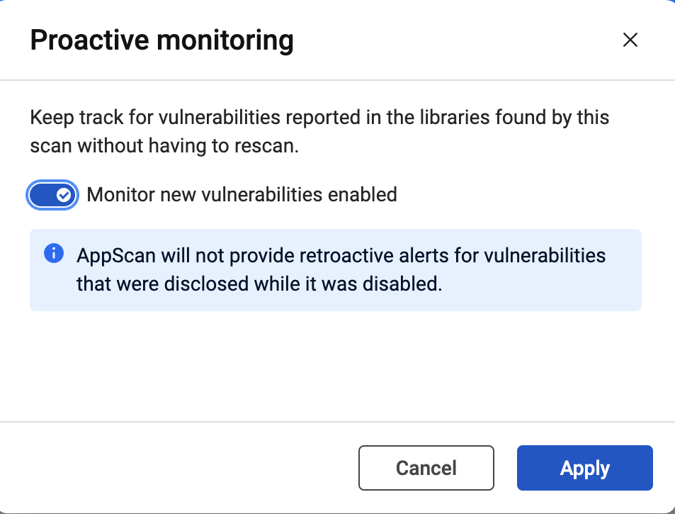 可以持续监控软件组成分析 (SCA) 扫描以确定是否存在新发布的 CVE。主动扫描可应用于新扫描及现有扫描。启用主动监控后,AppScan on Cloud 会每 24 小时检查一次新漏洞。
