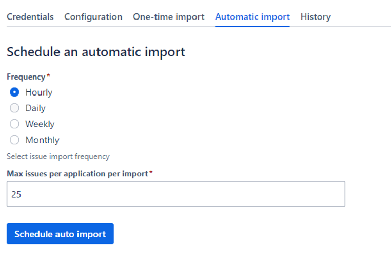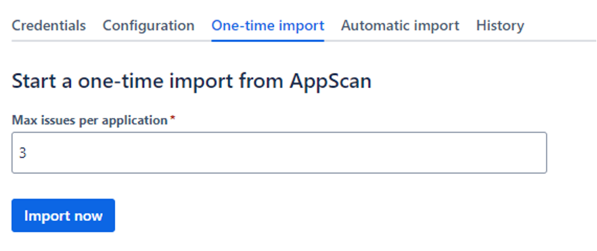 - 在 Jira Cloud 中的 HCL AppScan「整合」頁面上,按一下「一次性匯入」標籤。