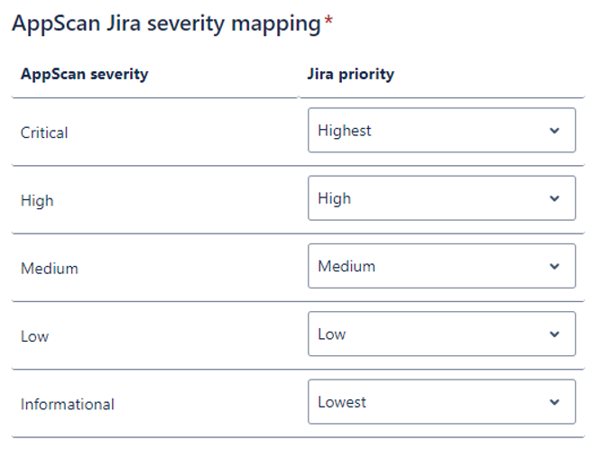 - 針對每個 AppScan 嚴重性,選取 Jira 優先順序,以最適合您組織的方式將 AppScan on Cloud 問題對應至 Jira 問題