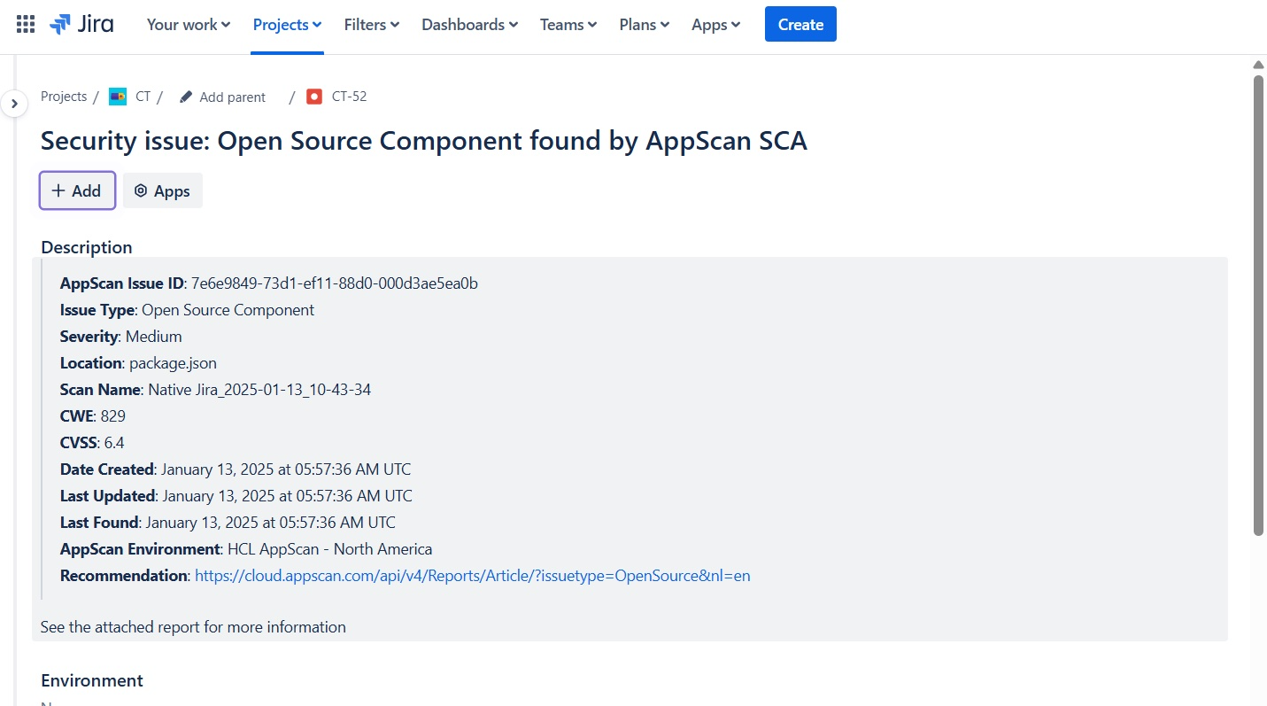 Jira Cloud 的 HCL AppScan 整合有助於針對 AppScan on Cloud 所發現的安全問題,自動或特定建立 Jira 問題單。