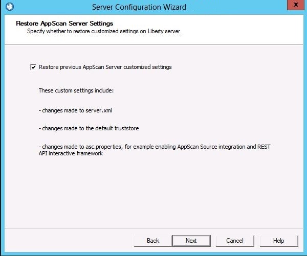 (Mise à niveau uniquement). Dans l'écran Restaurer les paramètres AppScan Server, vous pouvez choisir de restaurer les paramètres personnalisés AppScan Server précédents sur le serveur Liberty (par défaut). Cet écran apparaît une seule fois lors de la mise à niveau. Si vous exécutez l'assistant de configuration plus tard, cet écran n'apparaît pas. Voir Restauration des paramètres AppScan Server.