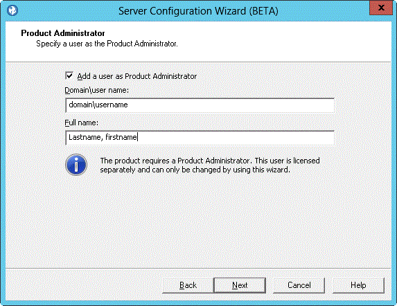 Dans la fenêtre Administrateur du produit, désignez un utilisateur comme administrateur du produit. Cet utilisateur dispose d'une licence distincte. Si vous voulez réaffecter la licence Administrateur de produit, vous devez exécuter à nouveau l'assistant de configuration. Voir Administrateur du produit.