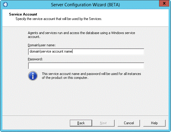 Dans la fenêtre Compte de service, entrez le compte de service de domaine/nom d'utilisateur et le mot de passe et cliquez sur Suivant. Voir Compte de service.