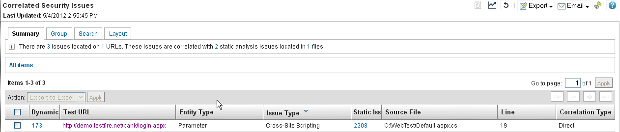 Si nous examinons le rapport A propos de ce problème pour SAST, l'examen du code a détecté la même vulnérabilité sur C:\WebTest\Default.aspx.cs, qui est la page de code source pour http://demo.testfire.net/bank/login.aspx.