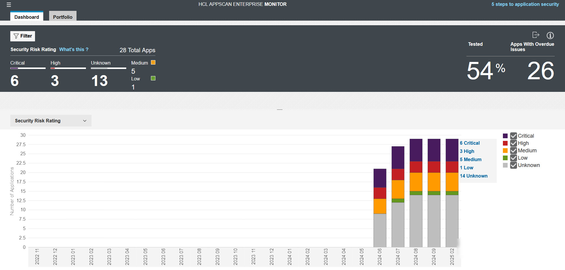 - CWE/SANS トップ 25: CWE トップ 25 の最も危険なプログラミング エラーに一致する問題を含むアプリケーションを識別します。詳細については、チャート セクションにマウスを移動します。ポートフォリオ タブをクリックして、トリアージ プロセスを続行します。