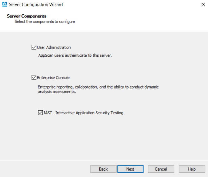 - AppScan® Enterprise Server のインストール後にウィザードを実行すると、SQL Server 上にデータベースがセットアップされ、コンポーネントの初期セットアップが行われます。
