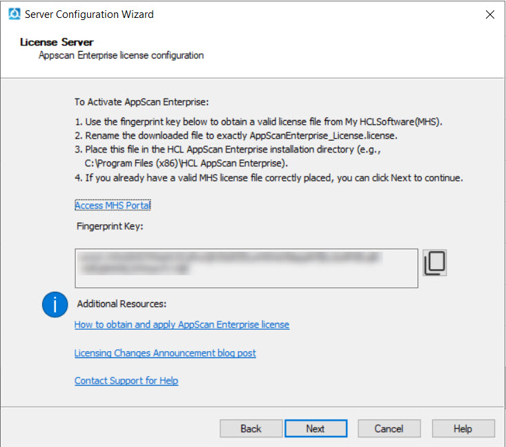 Server または Scanner をインストールまたはアップグレードした後、インストールされた各コンポーネントを構成し、すべてのインスタンスとすべてのサーバーで構成ウィザードを実行する必要があります。AppScan Enterprise はライセンスに MHS を使用します。ライセンス・プロセスにはフィンガープリント・キーが必要であり、これは構成ウィザードの実行時に生成されます。ウィザードを実行する前にこのキーを生成する必要がある場合は、AppScan Enterprise 用のマシン・フィンガープリントの生成で説明されているスタンドアロン・ユーティリティーを使用できます。