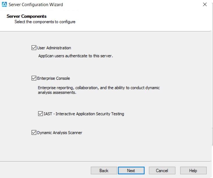 - AppScan® Enterprise Server のインストール後にウィザードを実行すると、SQL Server 上にデータベースがセットアップされ、コンポーネントの初期セットアップが行われます。