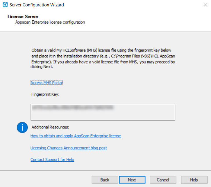 サーバーまたはスキャナーをインストールまたはアップグレードした後、インストールされた各コンポーネントを設定し、すべてのインスタンスとすべてのサーバーで設定ウィザードを実行する必要があります。AppScan EnterpriseはライセンスにMHSを使用しています。ライセンス取得のプロセスでは、設定ウィザードを実行すると生成されるフィンガープリントキーが必要です。