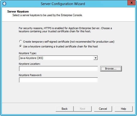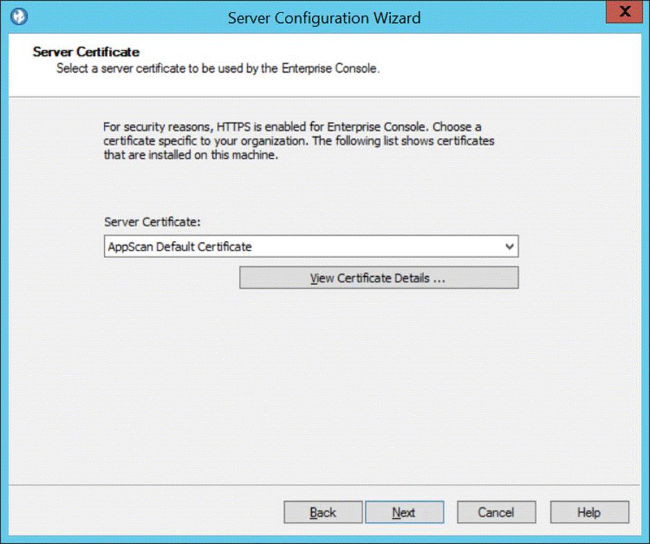 在服务器证书窗口中,选择特定于贵组织的证书。此步骤可帮助您在环境中部署安全的 AppScan® Enterprise。请参阅服务器证书。