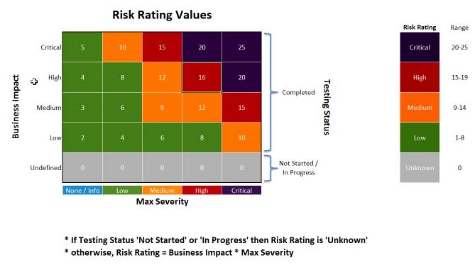 - 如果测试状态标记为“已完成”,并且没有“中”或“高”问题,则业务影响在计算中不予考虑。在该上下文中,“已完成”并不表示已发现所有漏洞,而表示您关心的漏洞已解决,并且剩余的问题不对应用程序造成任何风险。