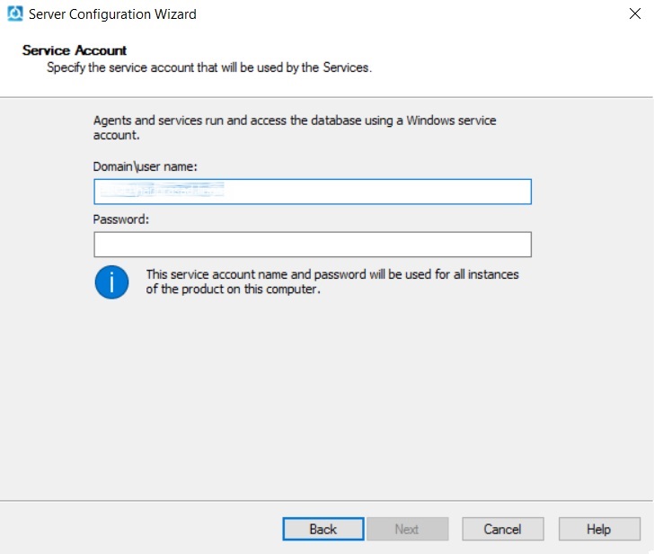 - 配置期间,定义要使用的 SQL Server 数据库的名称和位置以及服务帐户名称和密码。运行配置向导的用户必须能够创建数据库和授权。