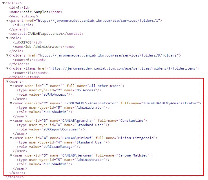 该 REST 服务将返回 <folder> 元素的集合。每个 <folder> 元素都包含有关该特定文件夹的信息,其中包括该文件夹的标识、名称、描述、联系信息和其内容的链接。