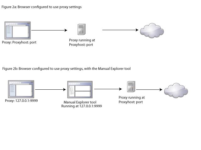 圖 1(a) 顯示瀏覽器未配置成使用任何 Proxy 設定的典型實務。圖 1(b) 顯示從 Manual Explorer 工具啟動瀏覽器時,瀏覽器的行為如何變化。該工具將瀏覽器的 Proxy 設定變更為 127.0.0.1:9999,這是內部 Proxy 伺服器的預設配置。當瀏覽器關閉時,Proxy 設定會回復成先前的瀏覽器設定(以此案例而言,是沒有 Proxy 設定)。