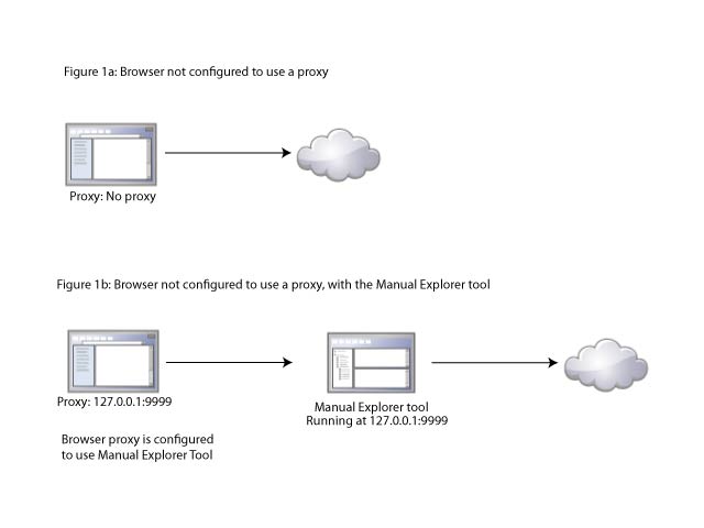 圖 1(a) 顯示瀏覽器未配置成使用任何 Proxy 設定的典型實務。圖 1(b) 顯示從 Manual Explorer 工具啟動瀏覽器時,瀏覽器的行為如何變化。該工具將瀏覽器的 Proxy 設定變更為 127.0.0.1:9999,這是內部 Proxy 伺服器的預設配置。當瀏覽器關閉時,Proxy 設定會回復成先前的瀏覽器設定(以此案例而言,是沒有 Proxy 設定)。