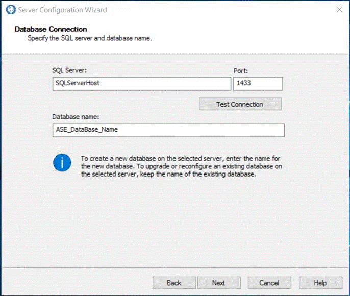 - 在資料庫連線視窗中,輸入 SQL Server 名稱、埠號和您要連接的資料庫名稱。您可以按一下測試連線,確定可以連接至 SQL Server。配置精靈在連線成功之前不會繼續。當 AppScan® Enterprise Server 在 SQL Server 中建立該資料庫時,它會自動配置它的對照順序。