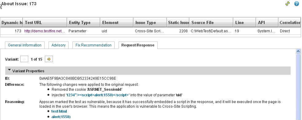 如果我們查看 DAST 的「關於此問題」報告,就會知道這個問題是在 'uid' 參數中發現的,問題症狀是 ASP.NET_SessionID cookie 被移除,然後在 'uid' 參數的值中注入了 '1234"/>alert(1558)</script>'。因為 Appscan 已成功地將 Script 嵌入回應,並且一旦頁面載入至使用者瀏覽器後將執行,所以將此測試標示為易受攻擊。這表示位於下列 URL 的應用程式易受到「跨網站 Scripting」的攻擊:http://demo.testfire.net/bank/login.aspx.