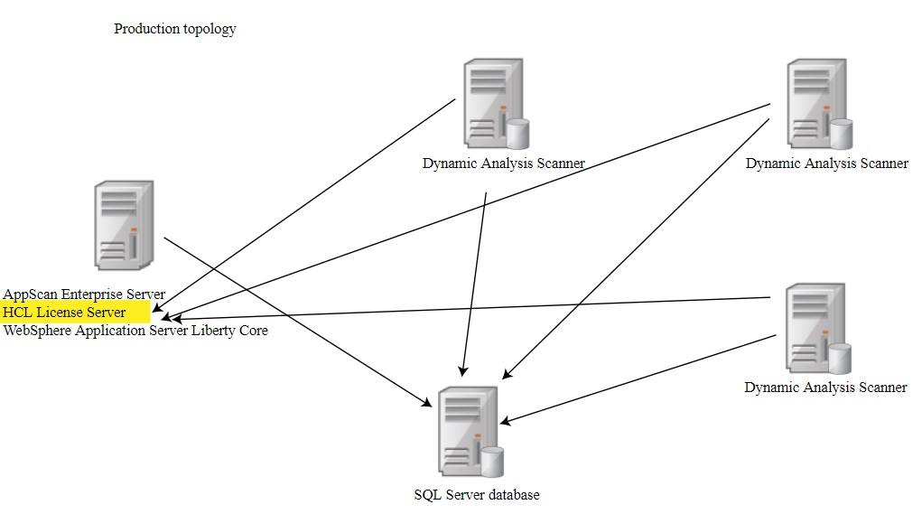 AppScan® Enterprise 元件可安裝在多部機器上。在這個實務範例中,元件部署在多台機器的環境中。HCL® License Server、AppScan® Enterprise Server、AppScan® Dynamic Analysis Scanner 及 SQL Server 資料庫全都安裝在不同的機器上。
