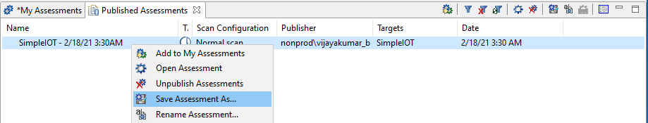 - From the Published Assessments view, right-click on the assessment to be exported and select “Save Assessment As…”. Locate to the folder to which to export the assessment file and click Save.