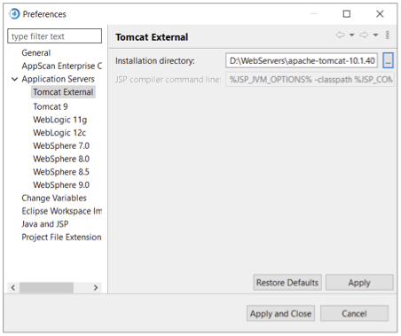 Apache Tomcat version 9 is included in the installation of AppScan® Source. If you want to employ an external supported Tomcat compiler, use the Tomcat External preference pages to point to your local Tomcat installation. AppScan® Source compiles JSP files using the application server JSP compiler that is currently marked as default.