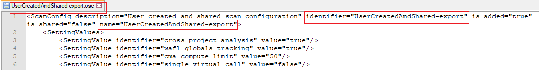 <data_dir>/.HCL/AppScanSource/config. - Renommez le fichier avec le nom de la configuration d'examen d'origine. Par exemple,