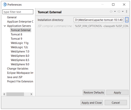Apache Tomcat version 9 est inclus dans l'installation de AppScan® Source. Si vous souhaitez employer un compilateur Tomcat externe pris en charge, utilisez les pages de préférences Tomcat externe pour pointer sur votre installation Tomcat locale. AppScan® Source compile les fichiers JSP à l'aide du compilateur JSP du serveur d'applications actuellement marqué comme fichier par défaut.